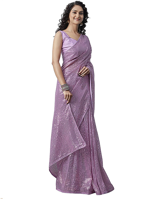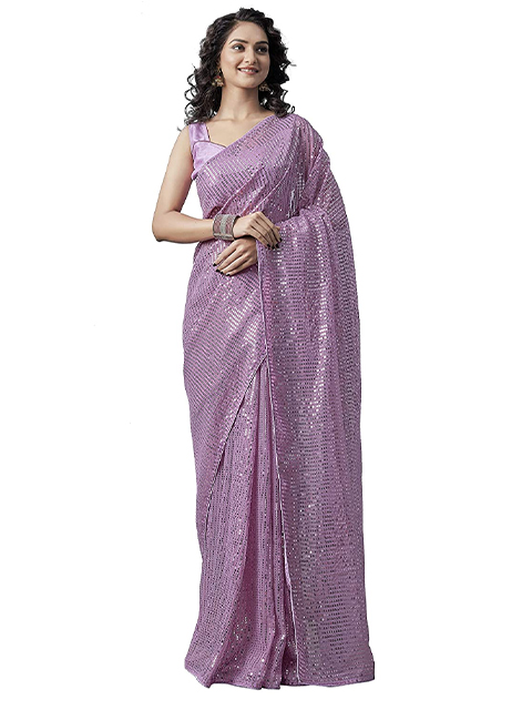 Saree with embellished border. It's decorated with beads and stones. There's an unstitched blouse piece with the saree. Maybe the blouse is just for modeling purposes. You can see how the blouse looks in the image.