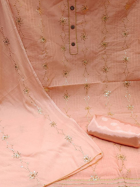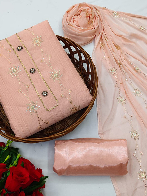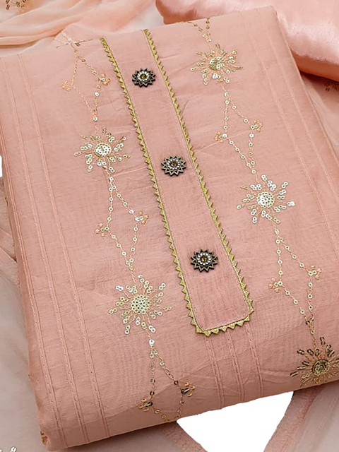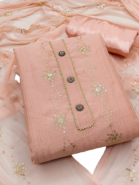 Grab the second look in this Pink colored Festive wear dress material. This modal chanderi suit is beautifully adorned with sequence work with comes along with santoon bottom and inne, with sequence work modal dupatta which makes it appear more adorning. Women can buy this suit to wear for their upcoming casuals, daily wear, office use.