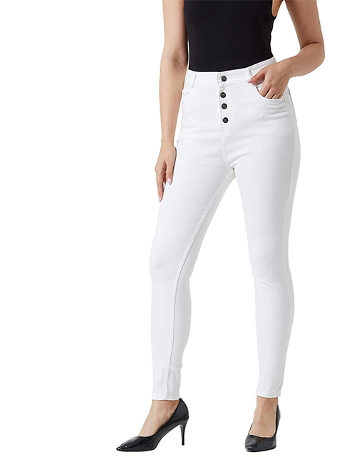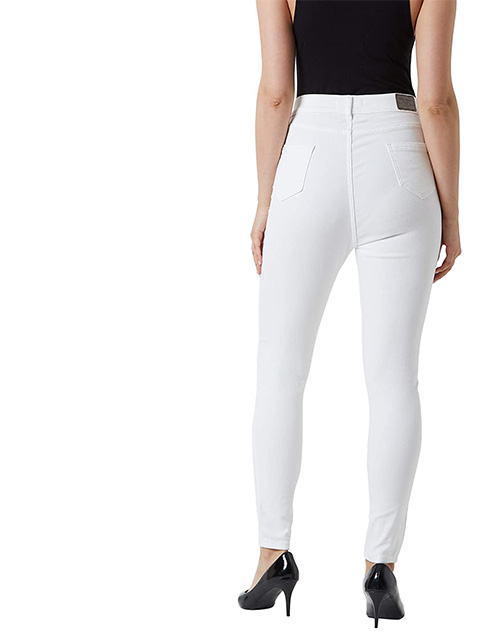White skinny fit high rise Regular length bleached denim jeans, Has five pockets and a button fly closure, Has a clean look